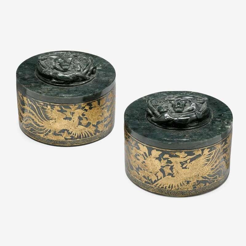 A pair of Chinese spinach jade covered boxes qing dynasty