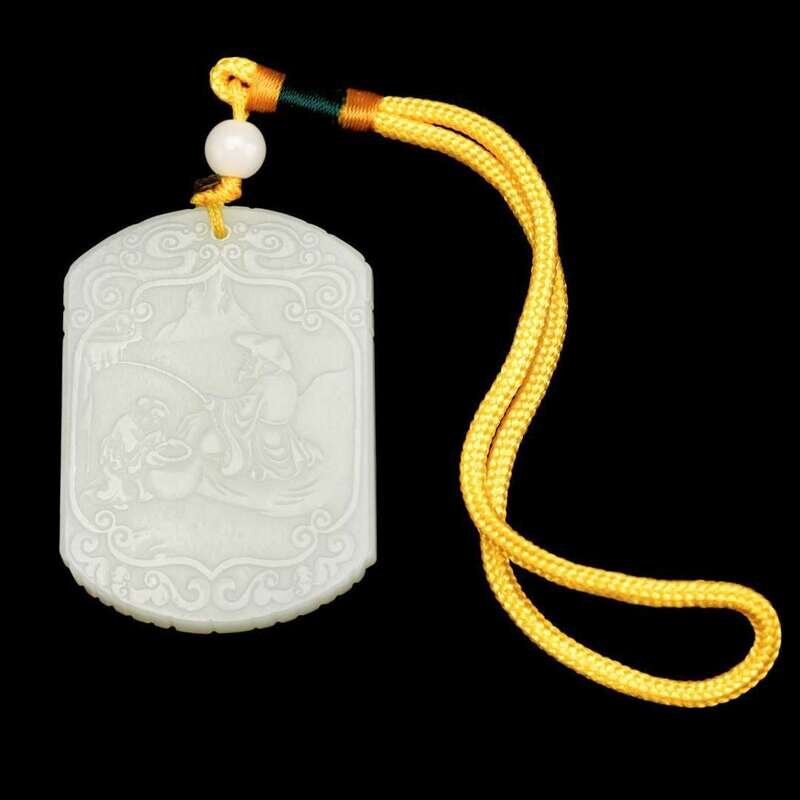 carved to depict a scene of a acolyte assists an elderly man fishing to front, and four character script "gong xi fa cai" to back with bamboo, prunus, and lingzhi, cloud carvings on both sides, pierced at top.