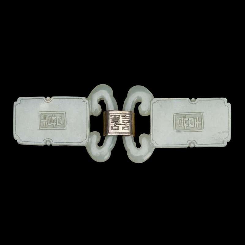 each in rectangular form topped by a ruyi shaped head, both carved to surface with the 'xi' character, connected by a silver buckle, jade of translucent quality with pale celadon tone (2).
