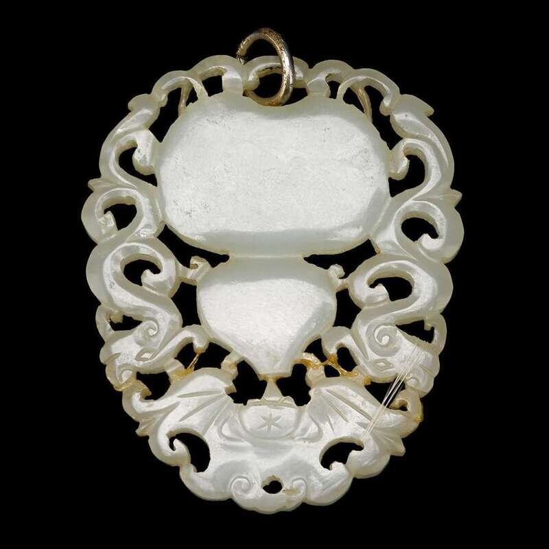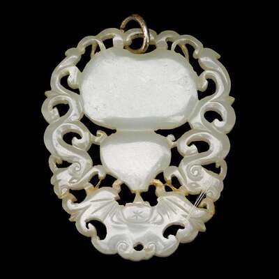 of rounded form, hollowed to show a fu bat over a double gourd, flanked by scrolling dragons to sides, jade of translucent white, attached with a metal ring to bottom.