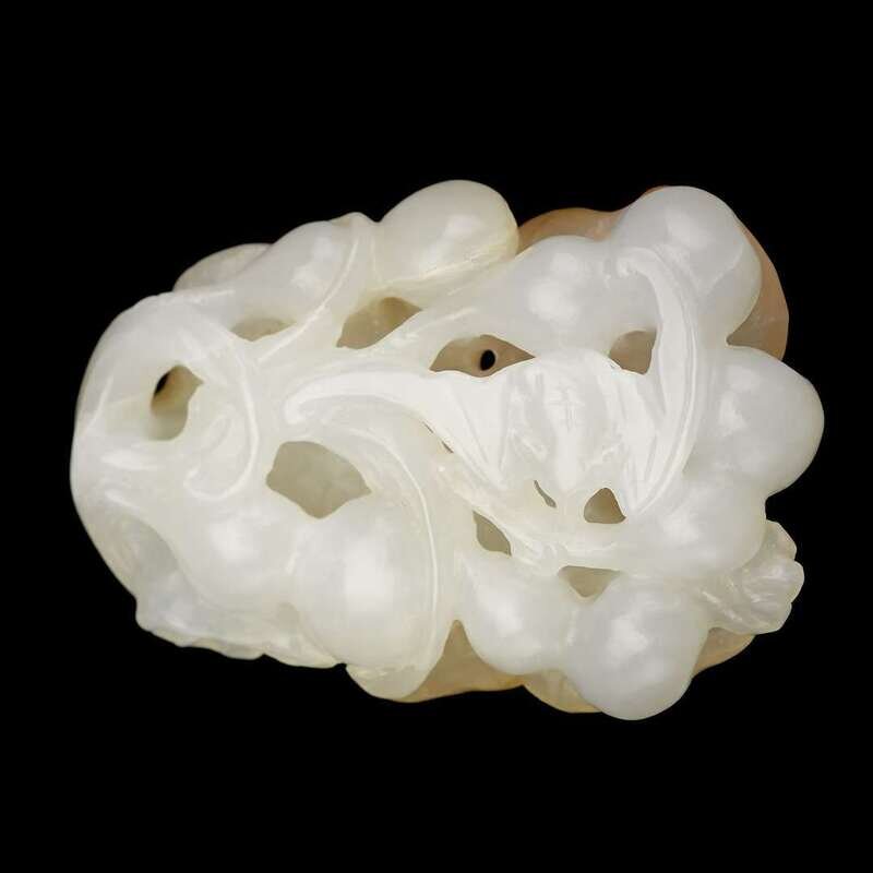 carved to depict a bat amidst gourds and branches, jade of translucent white hue and traces of russet to back.