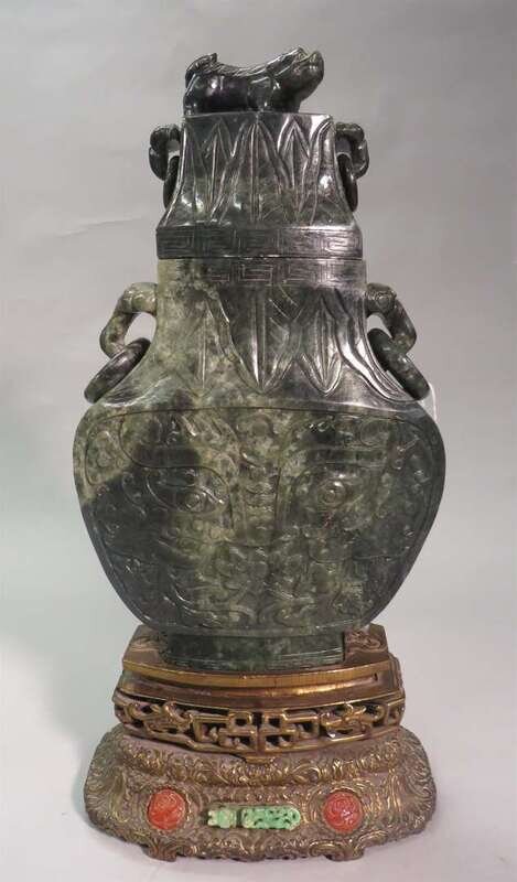 carved to body with taotie masks and a lion to lid, mounted over a bronze stand inset with a small jadeite belt hook, jade of dark green hue, jadeite of mottled emerald green.