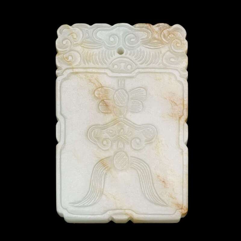 carved to one side showing a 'bajixiang' emblem and the other with a raised seal reading 'fu shou', jade of translucent white with strokes of russet to body.