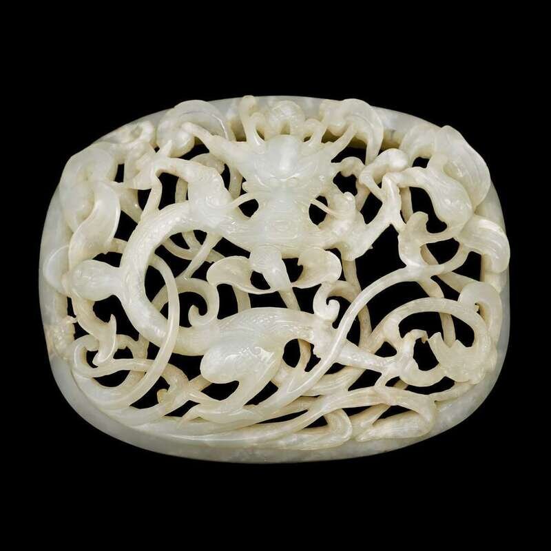 of slightly domed surface, sculpted and hollowed to show a menacing dragon among scrolling lotus vines, jade of translucent white with spots of milky inclusions.
