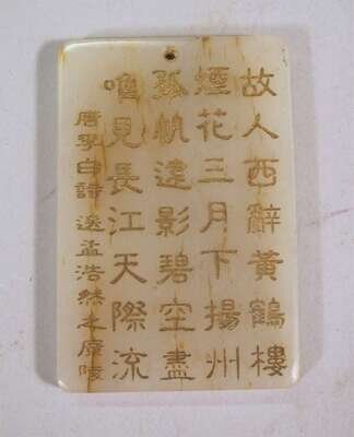 of rectangular prism form, gilted and inscripted to front and back with poems of Li Bai, white jade with russet streaks, pierced to top.