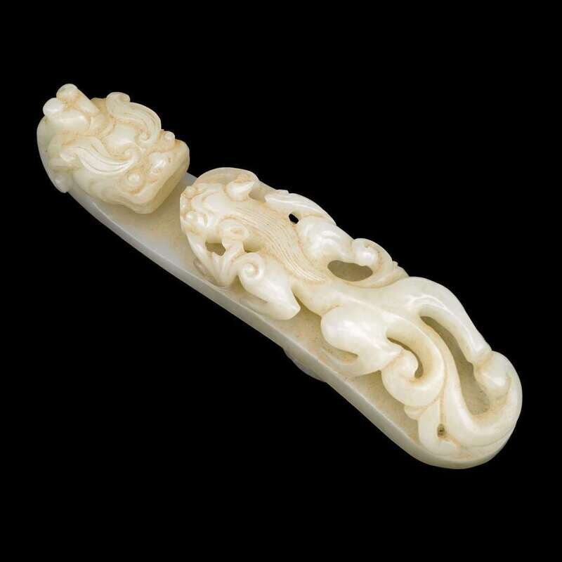 A large Chinese carved white jade garment hook