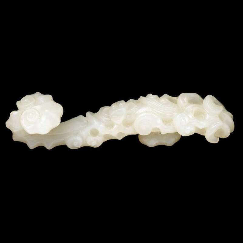 of ruyi form with lingzhi head and nob to back, carved throughout body with clusters of small lingzhi branches in mid-relief, jade of clear white tone.