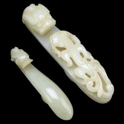 comprised of an unadorned celadon jade garment hook with simply carved dragon head, including two pierced holes to back, and a large white jade shaft finely carved with a chilong biting a lingzhi crawling towards a dragon head (2).