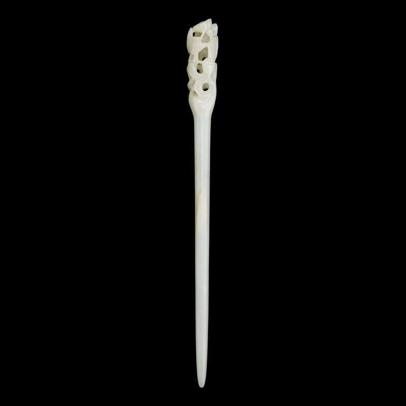 hollowed to head showing a magpie over flower branches, jade of translucent white with inclusions toward tip.