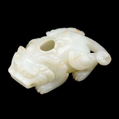 carved in the form of a crouching beast, topped with a circular opening to back, mouth with slit opening, jade of translucent white with milky inclusions as well as a few fissures to top and bottom.