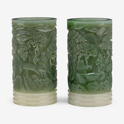 of cylindrical form, carved to show single figures in idyllic landscapes and adhered to ribbed white jade bases (2).