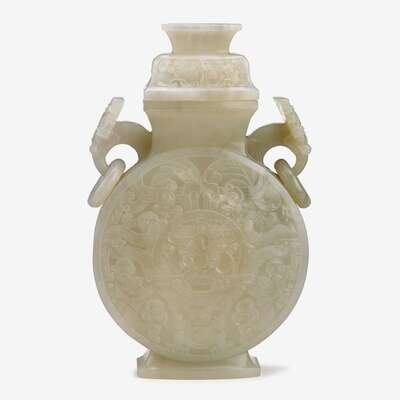 the body of flattened circular form supporting twin archaistic handles with freely carved rings, the body and square cover carved with stylized archaistic animals and masks.
