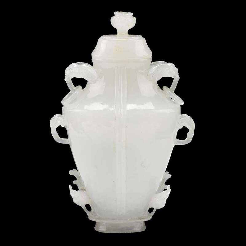of flattened tapering form raised on an everted foot, carved to show symmetrical cockerels to foot, sprig handles to shoulder, and hooped elephant head handles to neck, finial delicately work to show a flower blossom, jade of translucent white tone.