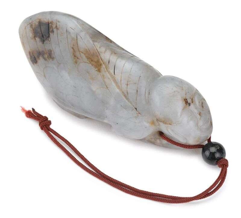 carved with the body of a cicada and a human face, jade of mottled grey with russet inclusions.