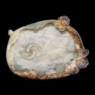 delicately carved to show two small cat fish inside a large lotus leaf, flanked by two lotus bulbs, a small frog, and a small turtle.
