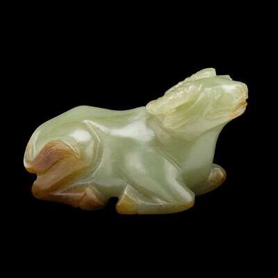 carved to show the recumbent animal with head raised and feet tucked under the body, jade with milky inclusions to side and russet to base.