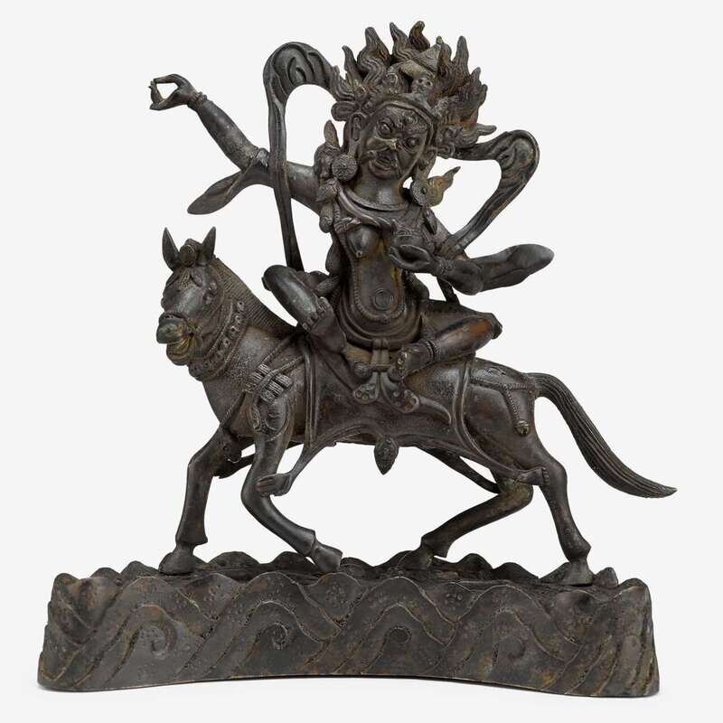 seated with open legs over a human-skin saddled horse, wearing open robe adorned by human-head necklaces, a flowing sash, and a fiery skull crown, one hand raised in karana mudra and the other holding a round cup near breast, the ominous horse in galloping position, rides over human body parts on a wave-like stand.