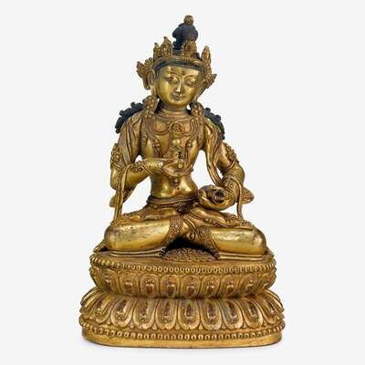 cast seated in dhyanasana over a double lotus base, holding a vajra in the left hand and a bell in the right hand, adorned with jewelry necklace and flowy sash to body, hanging earring and elaborate crown to head, blue pigment to hair.