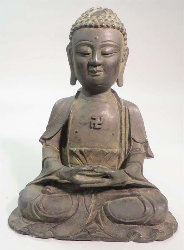 seated in dhyanasana with hands in the dhyanamudra, dressed in open robes, cast to show ornate floral designs to border of garment, swastika symbol protruding from chest, carrying a serene expression to face .