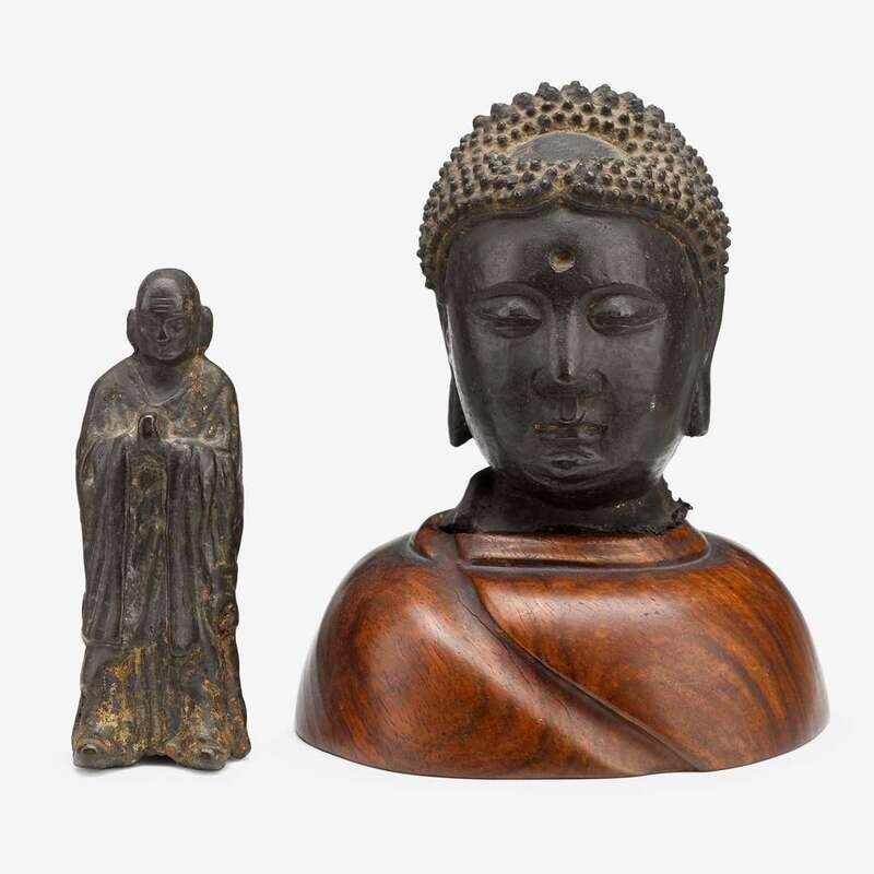 comprising a bronze head of Shakyamuni carrying a serene expression, fitted on a wooden stand, and a small luohan figure praying in namaskara mudra (2).