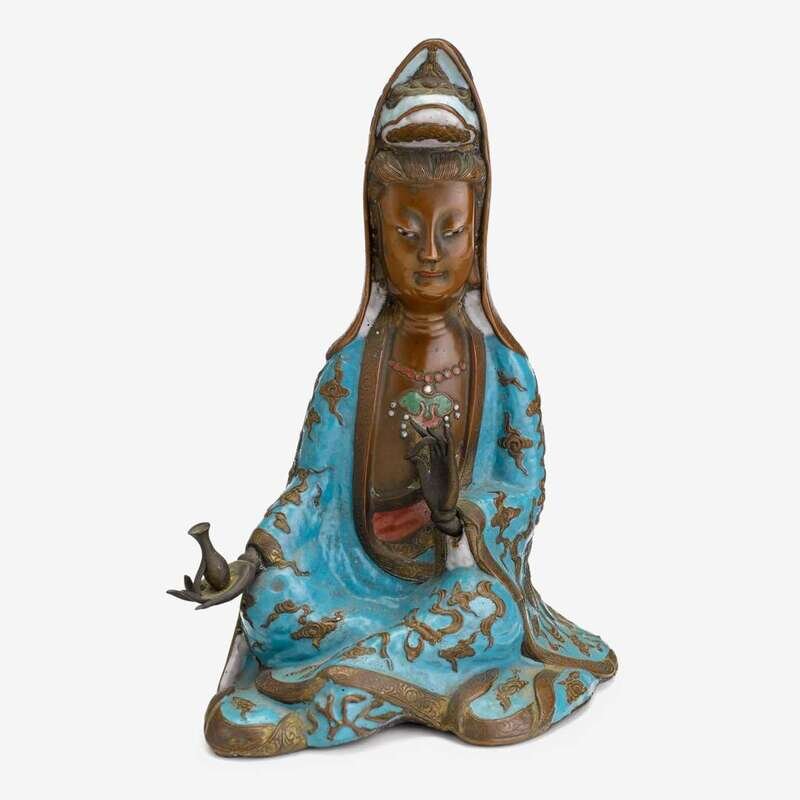 cast seated with one knee before the other, holding vitarkamudra in the left hand and a small bottle in the right, carrying a serene expression, dressed in open robe and head wrapping showing bajixiang and cloud designs, adorned by colored ornaments to chest and an elaborate headgear centered by a figure of Amitabha Buddha, base sealed with a sheet of metal.