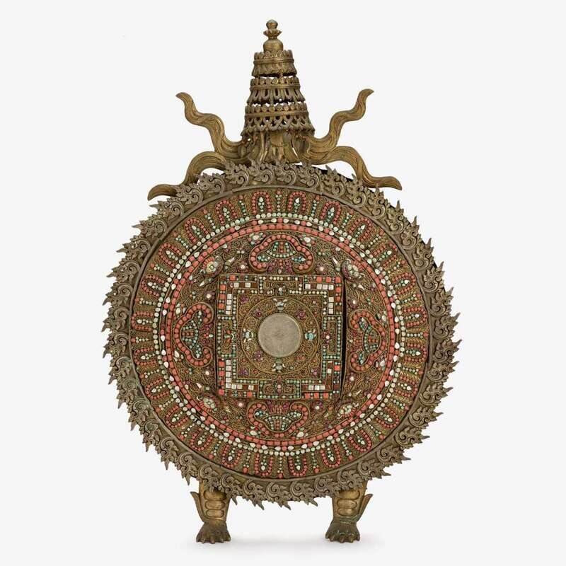 of convex form, centered by circular jade disk and radiating decorative bands and devices rendered in bronze wire filigree inset with coral beads, turquoise, pearls, and paste gems, with applied bronze flame border, lion feet and a detachable atapatra.