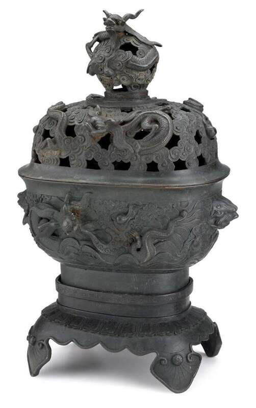 raised on a lotus petal and ruyi head adorned base, supporting an oblong vessel cast with double lion head handles and ferocious dragons among waves, the cover cast with dragons among ruyi cloud scrolls supporting a matching dragon and cloud finial.