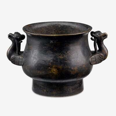 raised over a tall footring, of bulbous body and an everted rim, mounted with two phoenix like handles to sides.