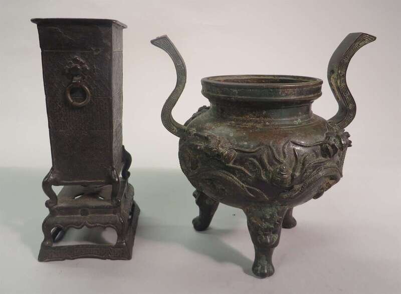 comprising a tripod censer cast with dragons and raised on lion mask legs, with Xuande mark to base, together with a square form incense holder with double ring handles and raised on an openwork base (2).