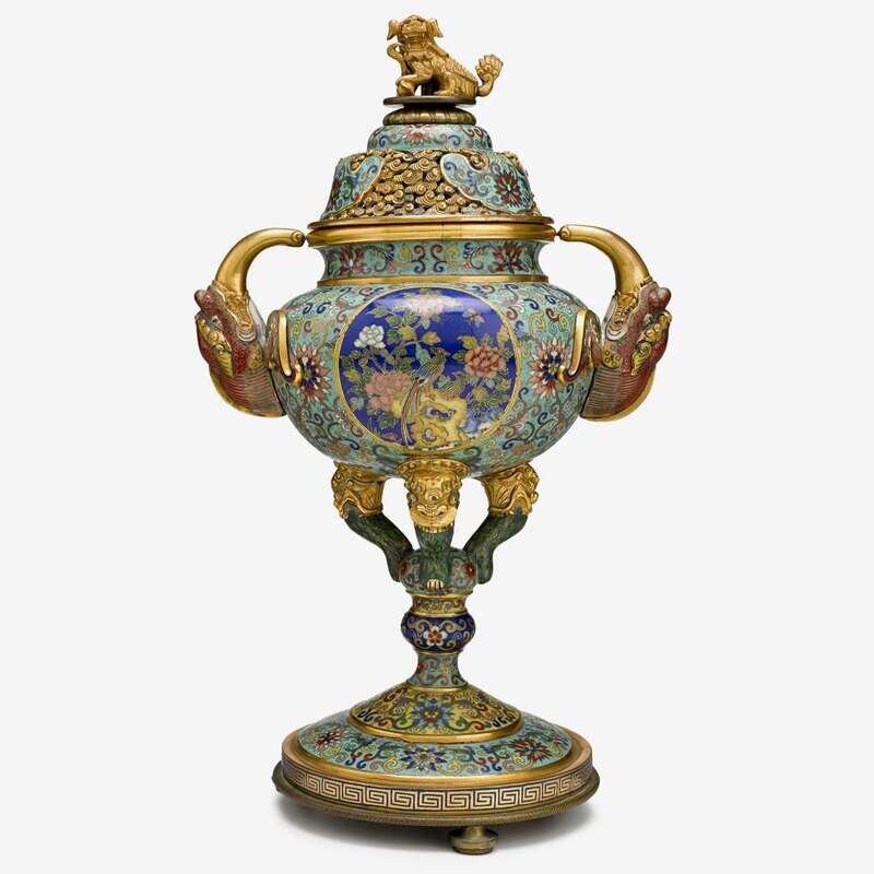 of compressed globular form, the tripod vessel is raised on dual ringed everted stand, enameled throughout with lotus flower motifs over a pale green ground and two circular emblems of peony and phoenix to body, mounted by two bat shaped handles and a carved and hollowed lingzhi lid adorned by a gilt fu lion.