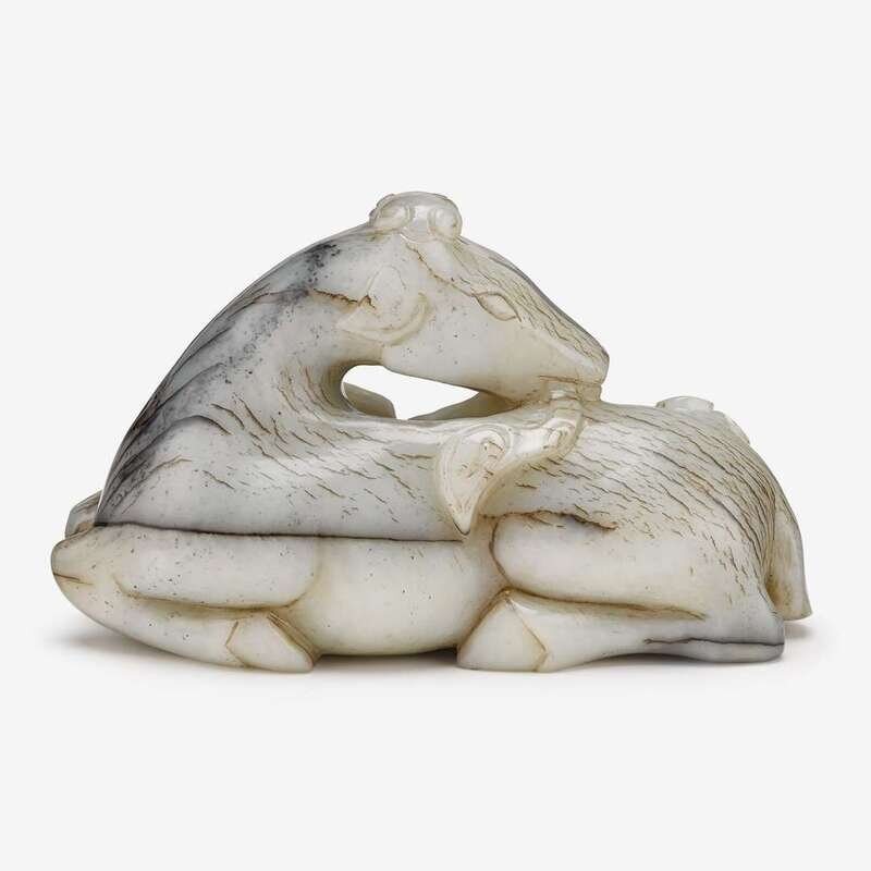 modelled in the recumbent position with tucked under hooves and holding a lingzhi branch in its mouth, it's horns carved as lingzhi heads; stone of light gray hue with contrasting black inclusions.