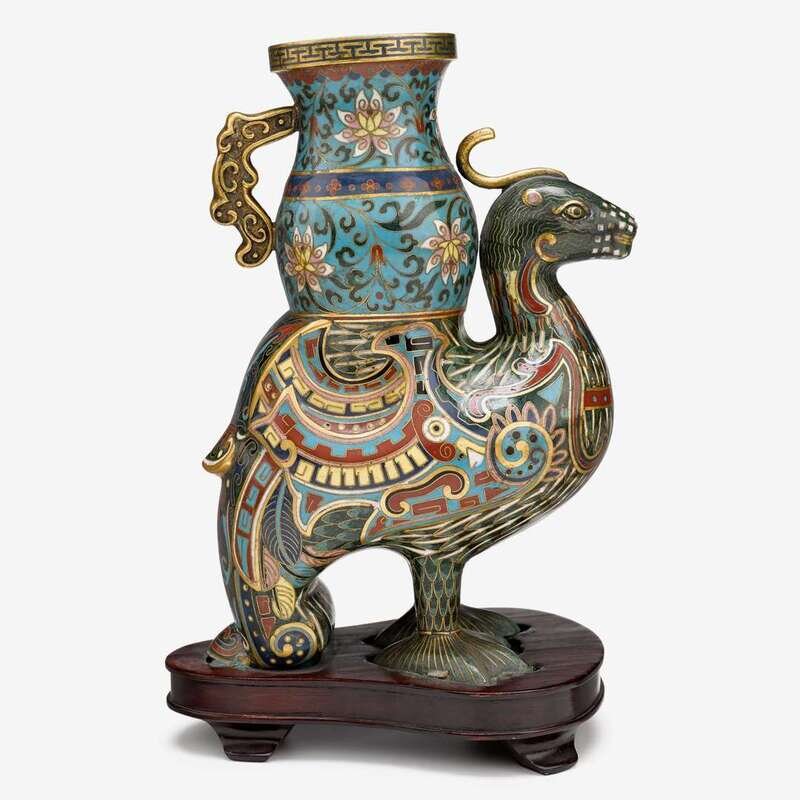 the ovoid shaped vessel decorated with lotus flowers and an everted rimmed mouth, suspended over a phoenix shaped beast, its tail curled downward, its feet palmed in supportive stand, body decorated with multicolored cloisonne enamels, attached to wooden stand.