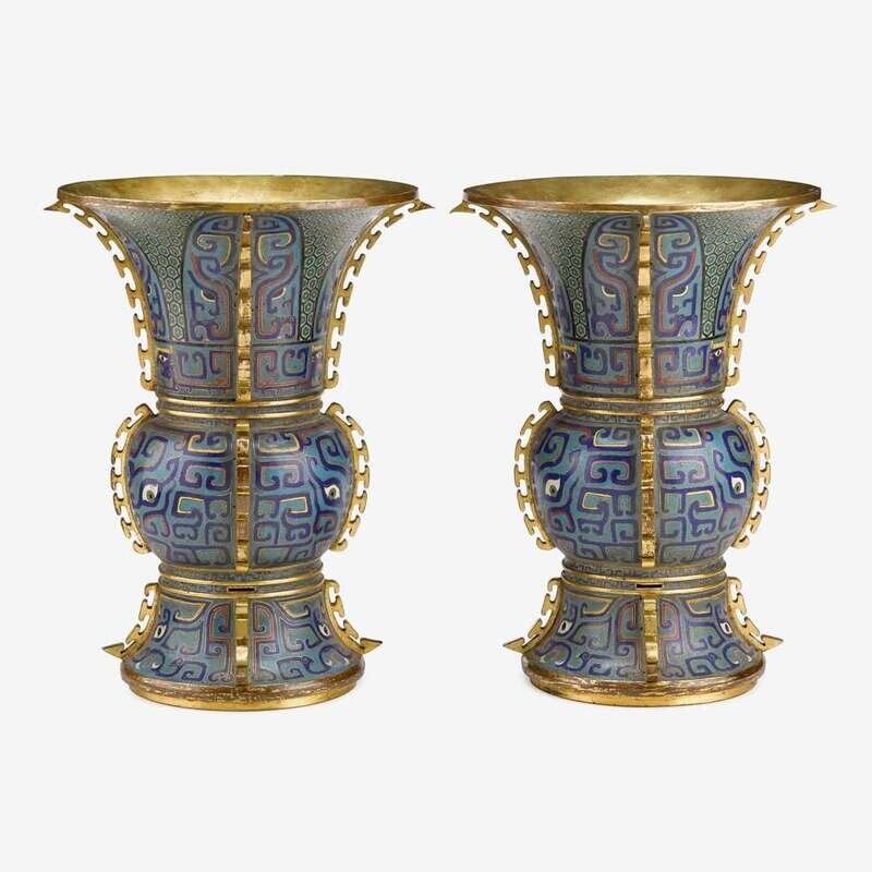 A pair of large Chinese cloisonné enameled bronze vessels, Gu kangxi reign mark, but later