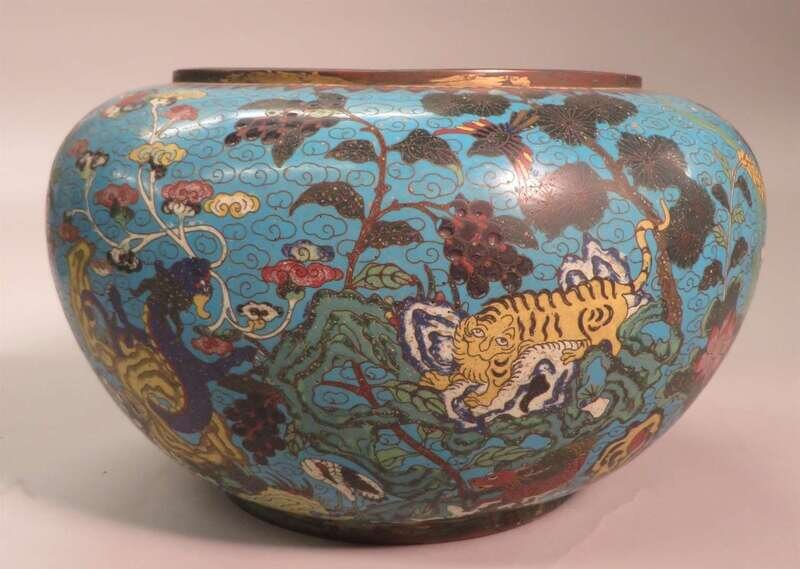 of globular form, decorated to body with birds flying amongst trees and flower sprays over a blue ground.