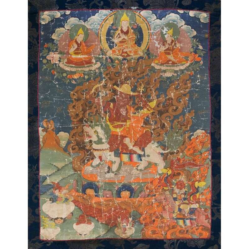 depicting the bodhisattva riding a fu lion dressed in the robes and riding hat of a lama.