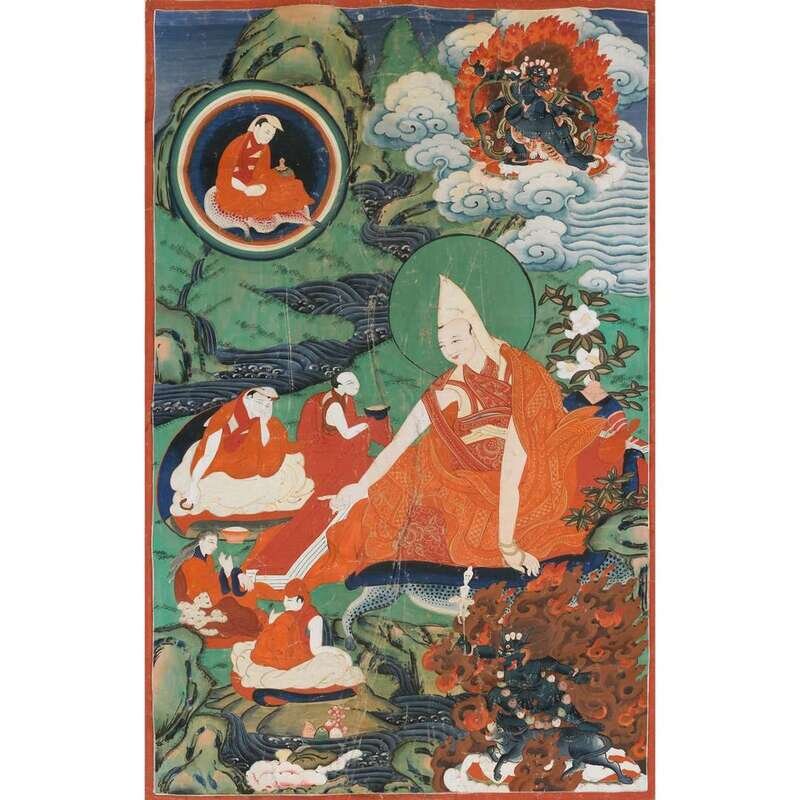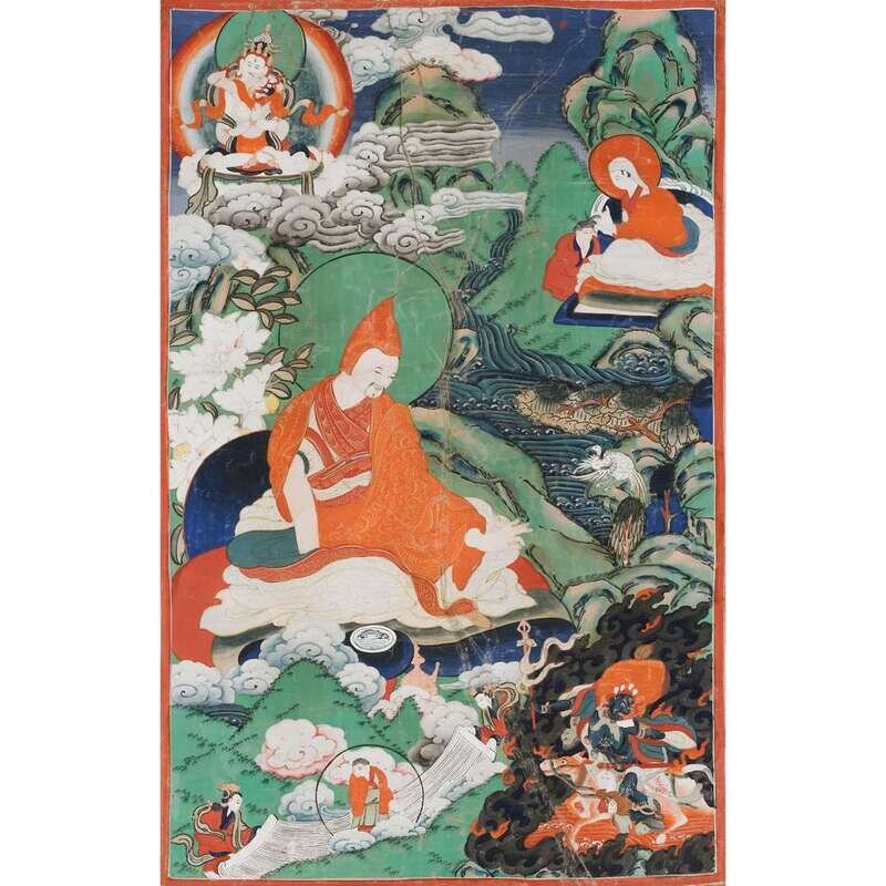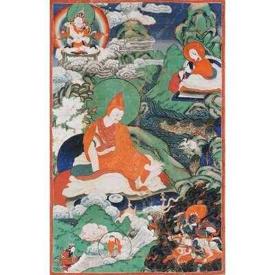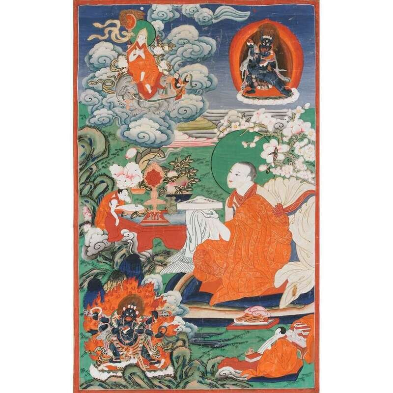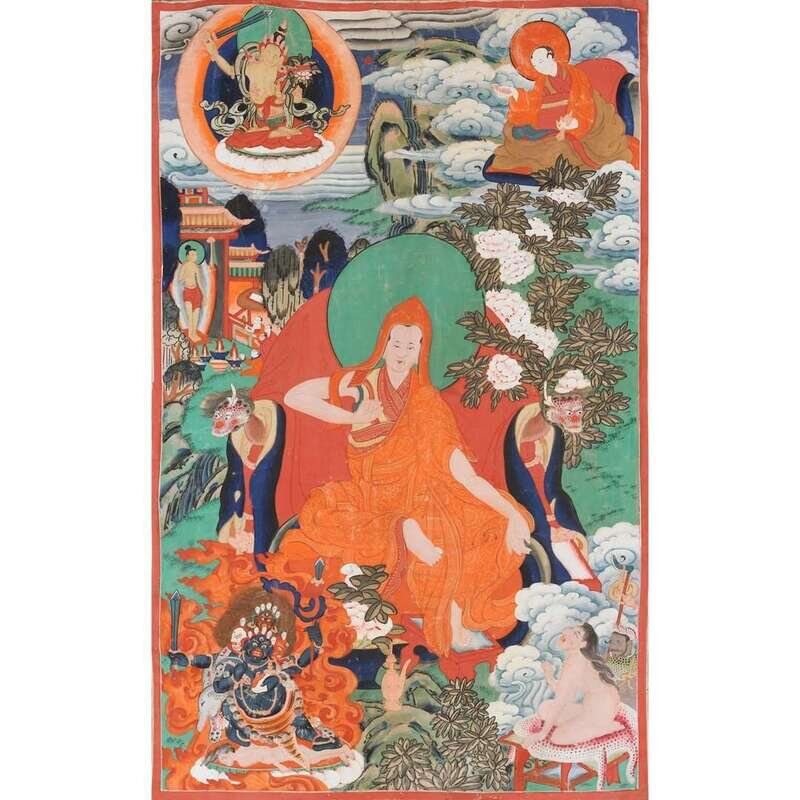 comprised of one depicting the arhat Pantha in the center stretching his hands surrounded by another arhat, Manjusri, and Hayagriva, one depicting the arhat Kanaka to right center lifting a bowl, surrounded by three other arhats and Hayagriva to top right and bottom left, one depicting the arhat Pindola seated over a covered deer, joined with five other arhats and Hayagriva to top and bottom right, and one depicting the arhat Pindola to left center, joined by Hayagriva on horse to bottom right, Guhyasamaja with his consort to top left, and another arhat to top right, each painted to depict figures and landscapes in bright hues, mounted over brocade fabrics (4).