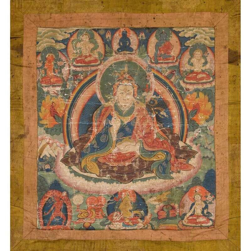 depicting a seated lama surrounded by various bodhisattvas and depictions of the Buddha.