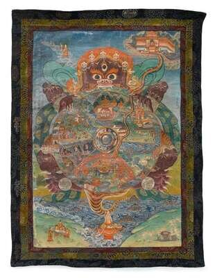 depicting the red-faced wrathful protector diety wearing a crown of skulls and dressed in tiger skin, holding a wheel depicting scenes of war, hell and life on earth.