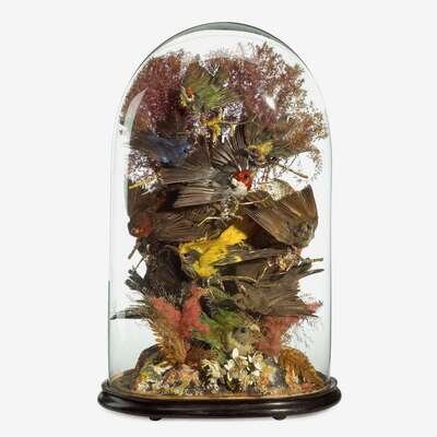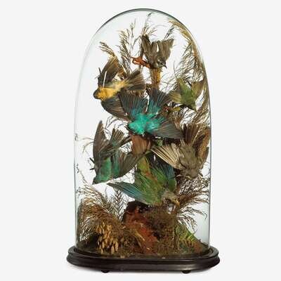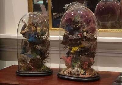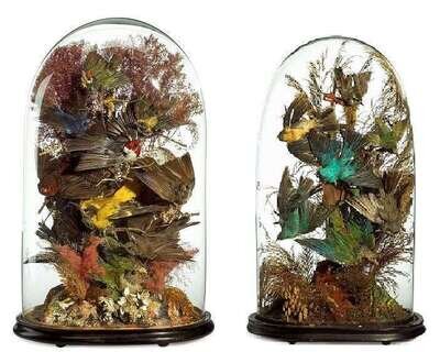 Two Victorian taxidermied bird specimens under glass domes late 19th century