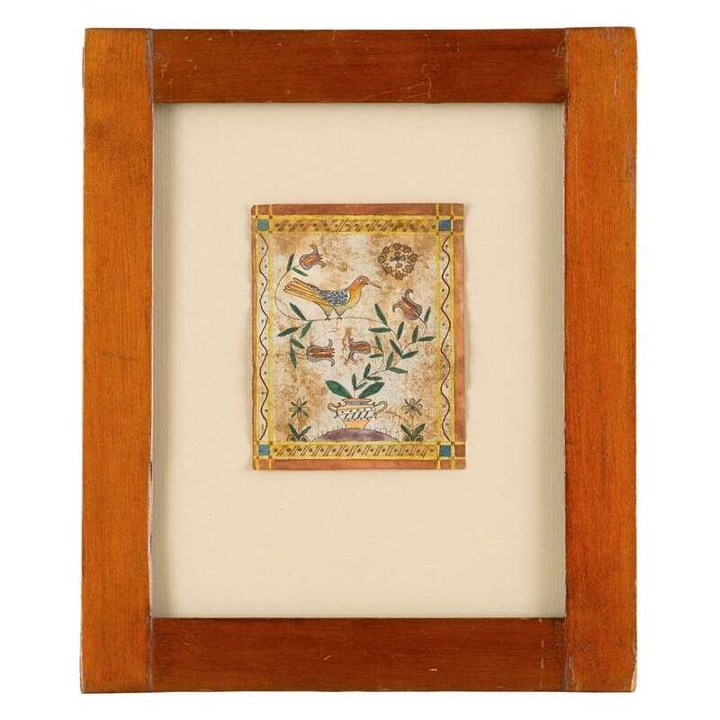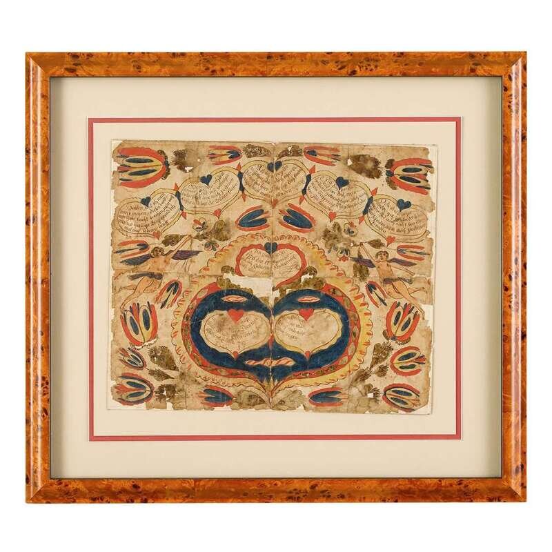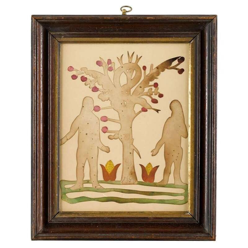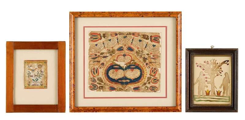 Including a paper cut-work of Adam and Eve flanking an apple tree and a snake; a fraktur with hearts, cupid and tulips, watercolor and ink on paper dated 1776; and a fraktur bookplate, watercolor and ink on paper, depicting bird on a potted plant.