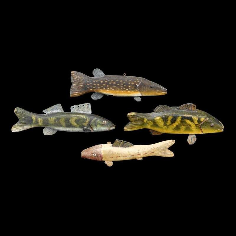 Four large carved and painted fish decoys all stamped "www" to underside of pectoral fin, probably michigan, 20th century