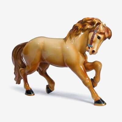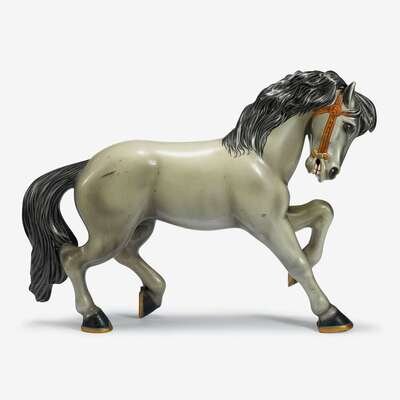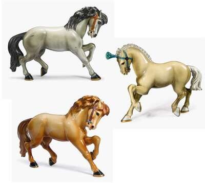 A carved and painted "Kiddie" horse and two fiberglass horses philadelphia toboggan company, germantown, philadelphia, pa, circa 1940s