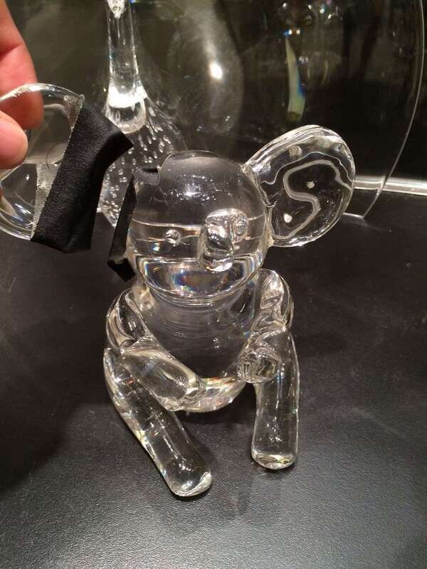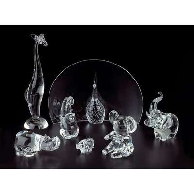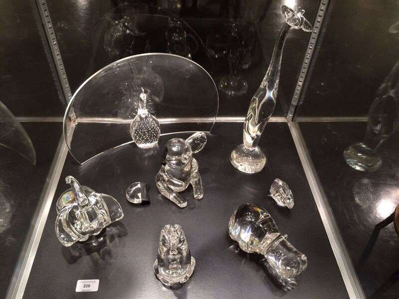 Comprising a majestic peacock centerpiece, a koala, a giraffe, a hippopotamus, a monkey and an elephant, all with etched signature to underside; together with a signed, rhinoceros hand cooler.