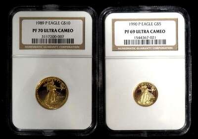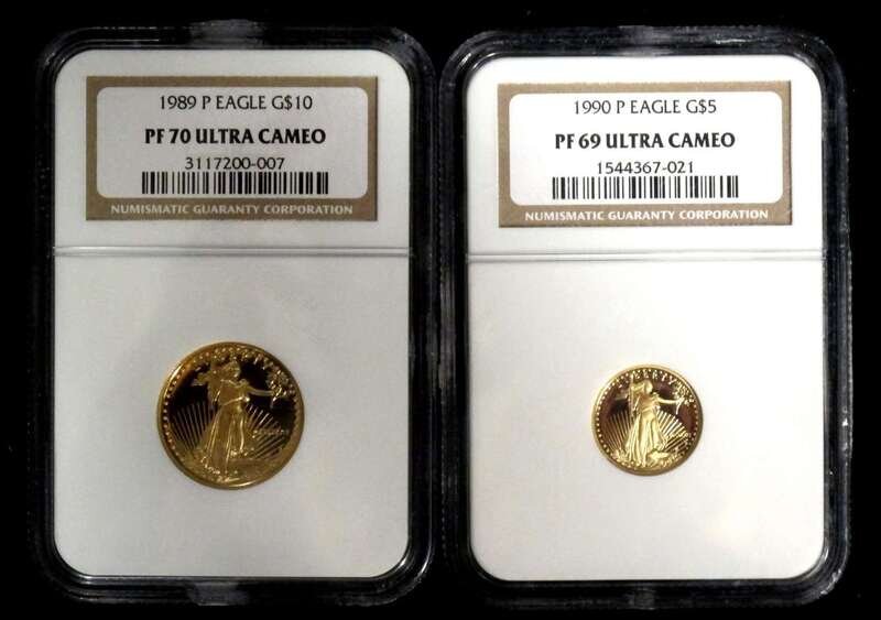 1989 $10 Eagle graded PF 70, Ultra Cameo; 1990 $5 Eagle graded PF 69, Ultra Cameo.