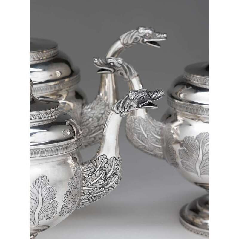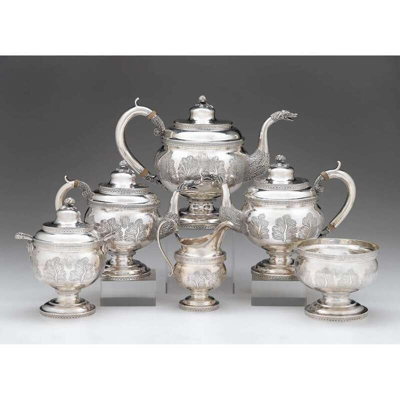 Comprising hot water pot, teapot, coffee pot, creamer, covered sugar, and waste bowl, each of globular form with lamb's tongue banding supported on stepped, circular base, the bodies finely chased with acanthus fronds, the domed lids capped by rosebud finials, the pots' spouts issuing from leafy clusters and terminating in dragon's heads, the covered sugar with twin-handles surmounting mask head joins, all pieces marked to underside and engraved with later monogram, "NYC."