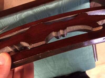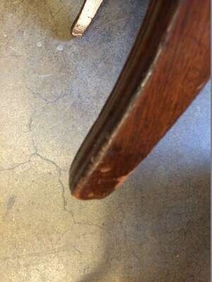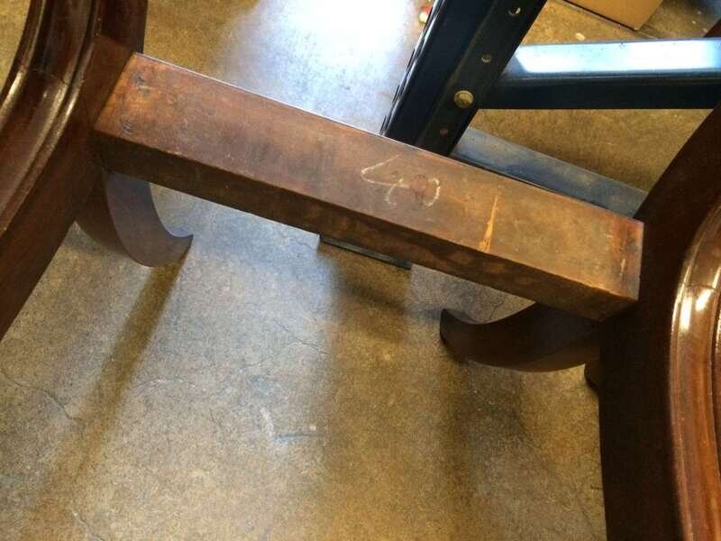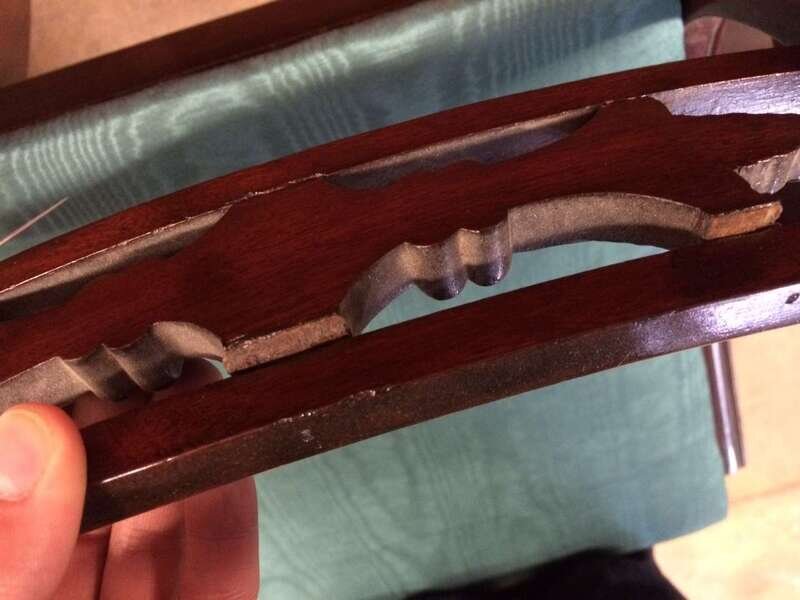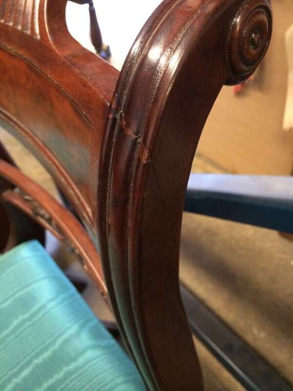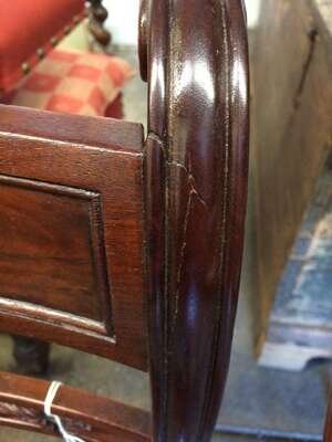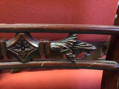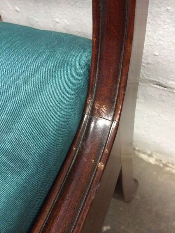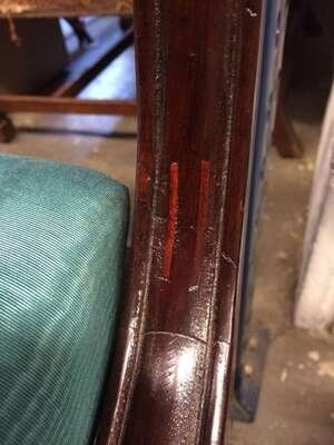 Each with carved and scrolling crestrail and pierced and carved backrest enclosed by molded stiles continuing to saber legs, joined by a molded seat rail, several bear handwritten labels or inscriptions, "Cope," "Phillip Garrett..." and a printed address label, "Miss Margaret Cope Awbury East Haines St. Germantown, Philadelphia."