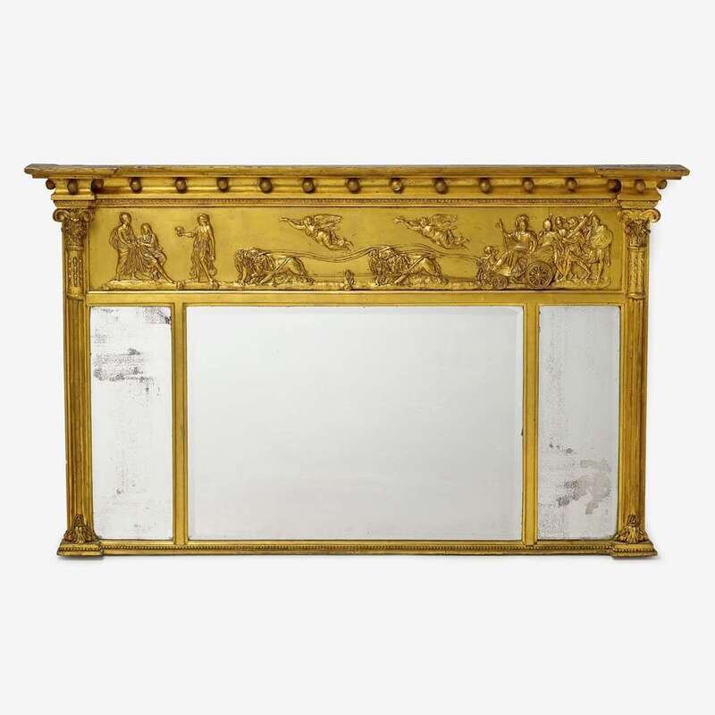 The stepped, projecting cornice hung with spherules surmounting Classical figural frieze depicting procession with soldiers, trumpeting putti, and gladiator in lion-drawn chariot, all above three mirror plates enclosed by Corinthian columns.