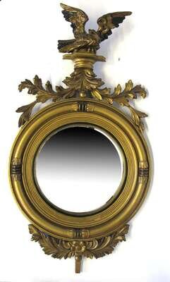 The convex mirror plate within a conforming giltwood frame, surmounted by an eagle finial on a plinth flanked by acanthus plumes.