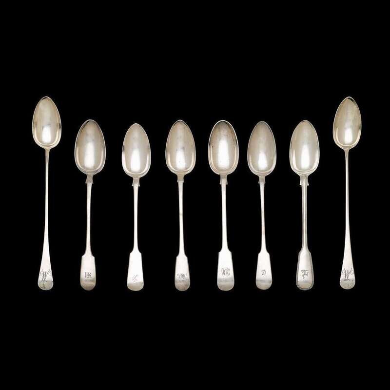 Comprising two by Thomas Wallis II, 1789-90; one by John James Whiting, 1833-34; one by John, Henry & Charles Lias, 1836-37; one by Robert Wallis,1845-46; one by Chawner & Co., 1857-58; one with maker's mark I.B.,1867-68; and one by Josiah Williams & Co., 1905-06; each with various monograms. (8).
