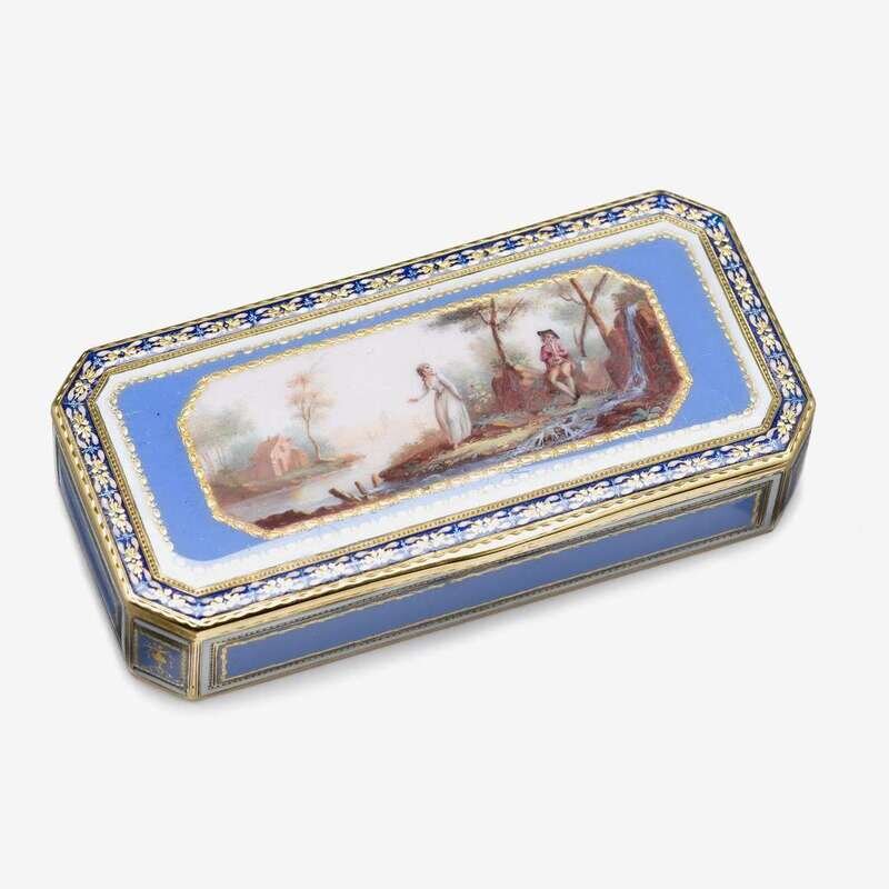 Rectangular with canted corners, the cover depicting a courting couple in a landscape within a periwinkle blue enamel frame, all within a gold and blue enameled floral border, decorated with urns at the angles.